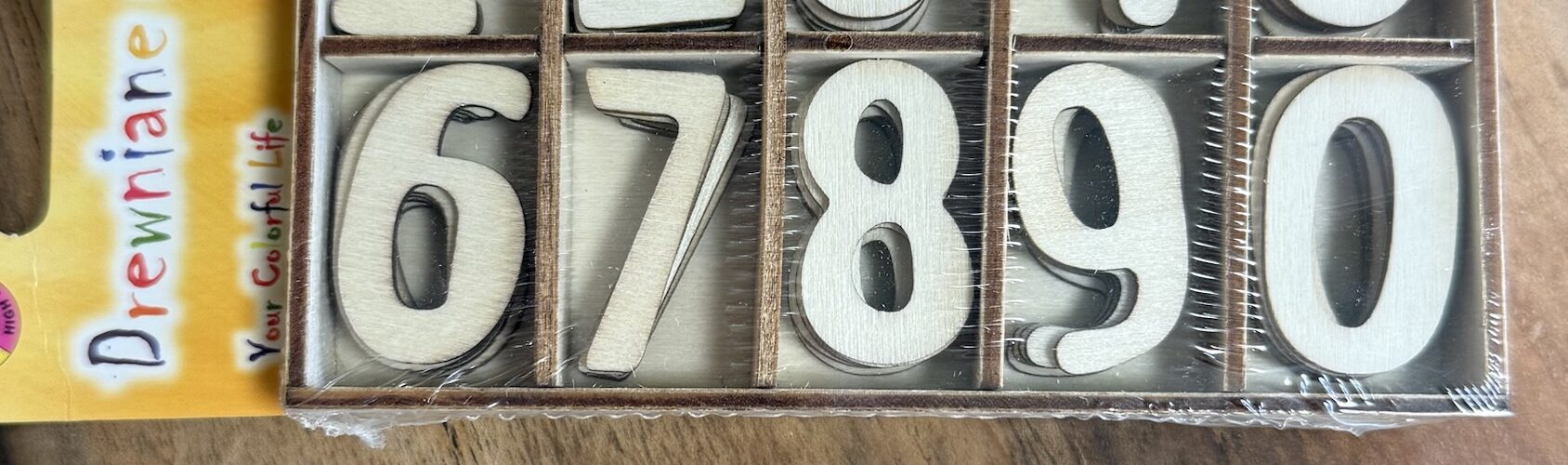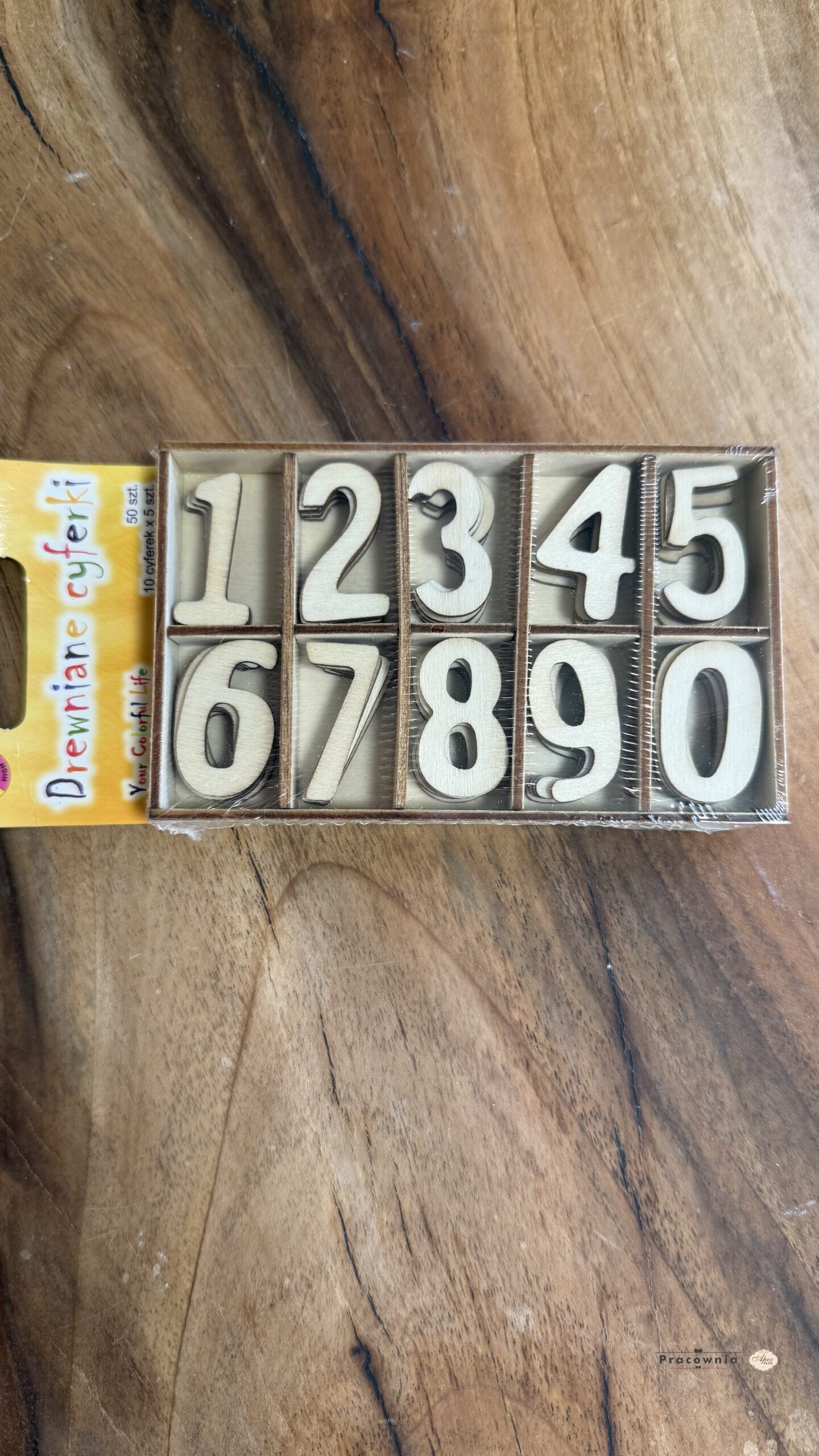 Drewniane cyferki w pudełku. 10 cyferek x 5 sztuk każda. wys. 3.8 cm SKU: CD-0697 EAN: 5902150680697