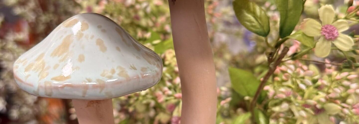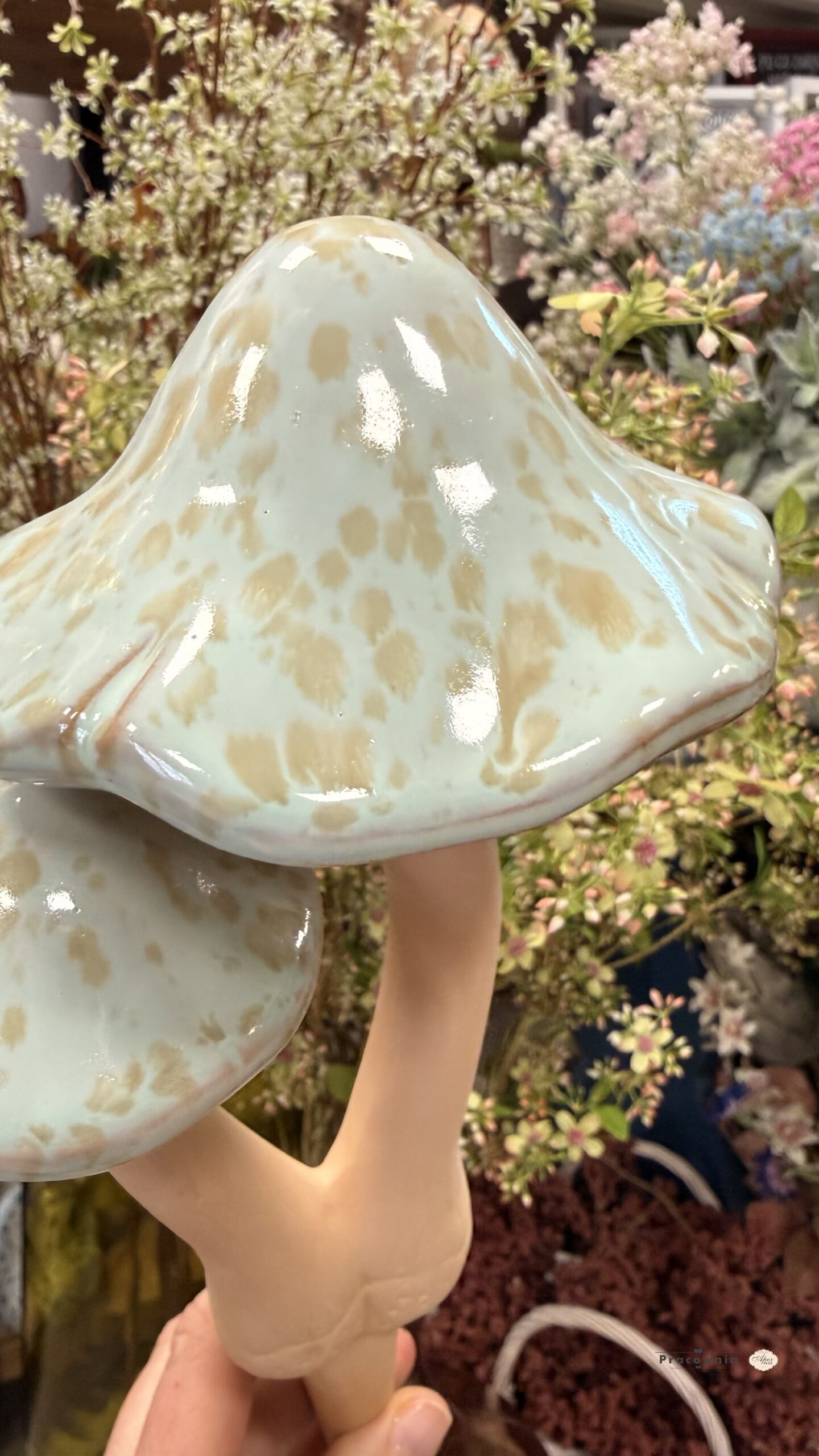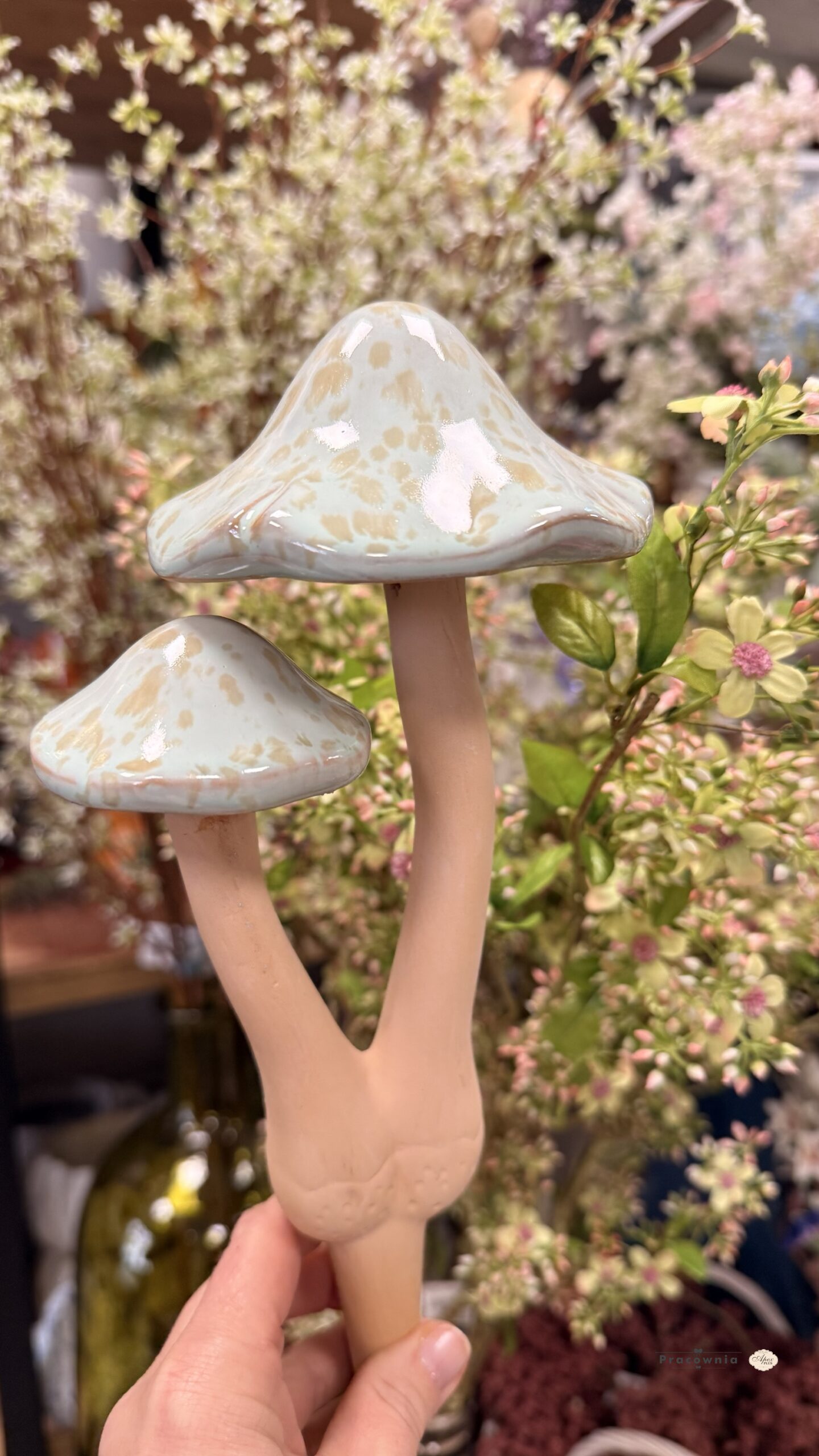 Grzyb ceramiczny podwójny9połączony korzeniem), z ruchomym kapeluszem w kolorze mięty z jasnobrązowymi ciapkami, o wys.30cm SKU: 297CAN50046 EAN: 5906688950611