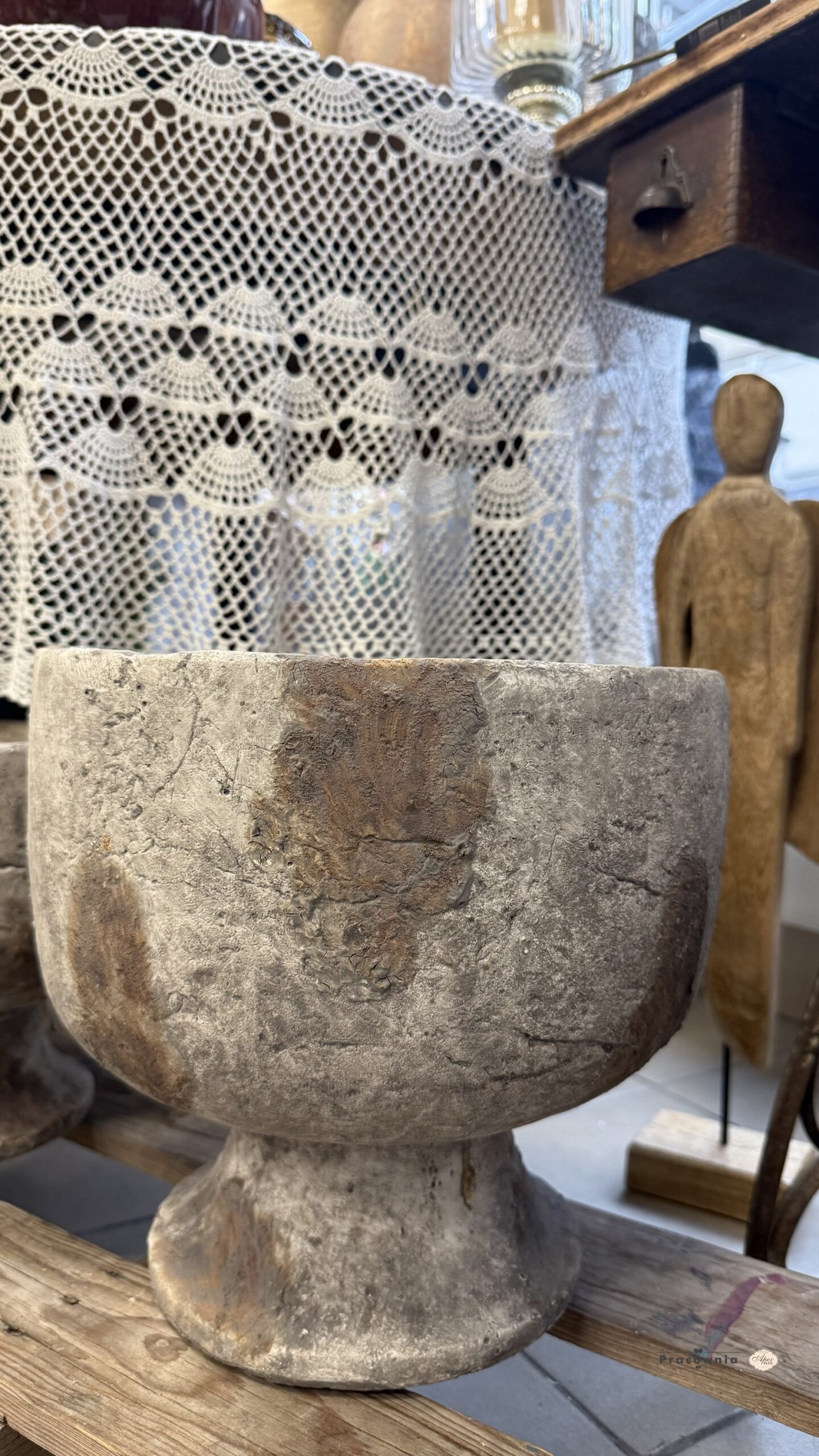 Osłonka betonowa na nóżce, w szaro- brązowych barwach. Idealna do ekspozycji roślin, kompozycji kwiatowych lub jako samodzielna dekoracja. wys. 28 cm śr. 30 cm SKU: 143849 EAN: 5902663438495
