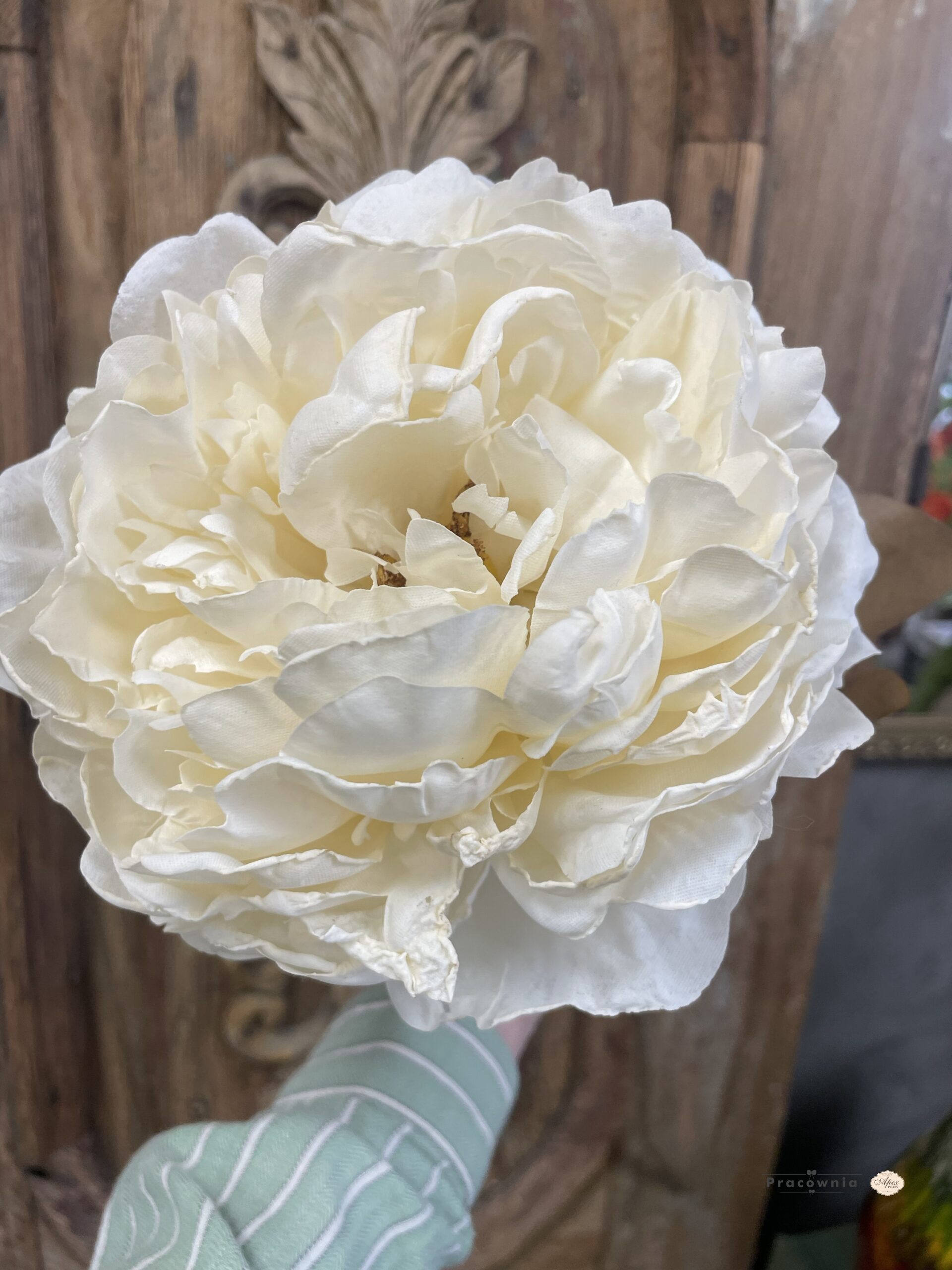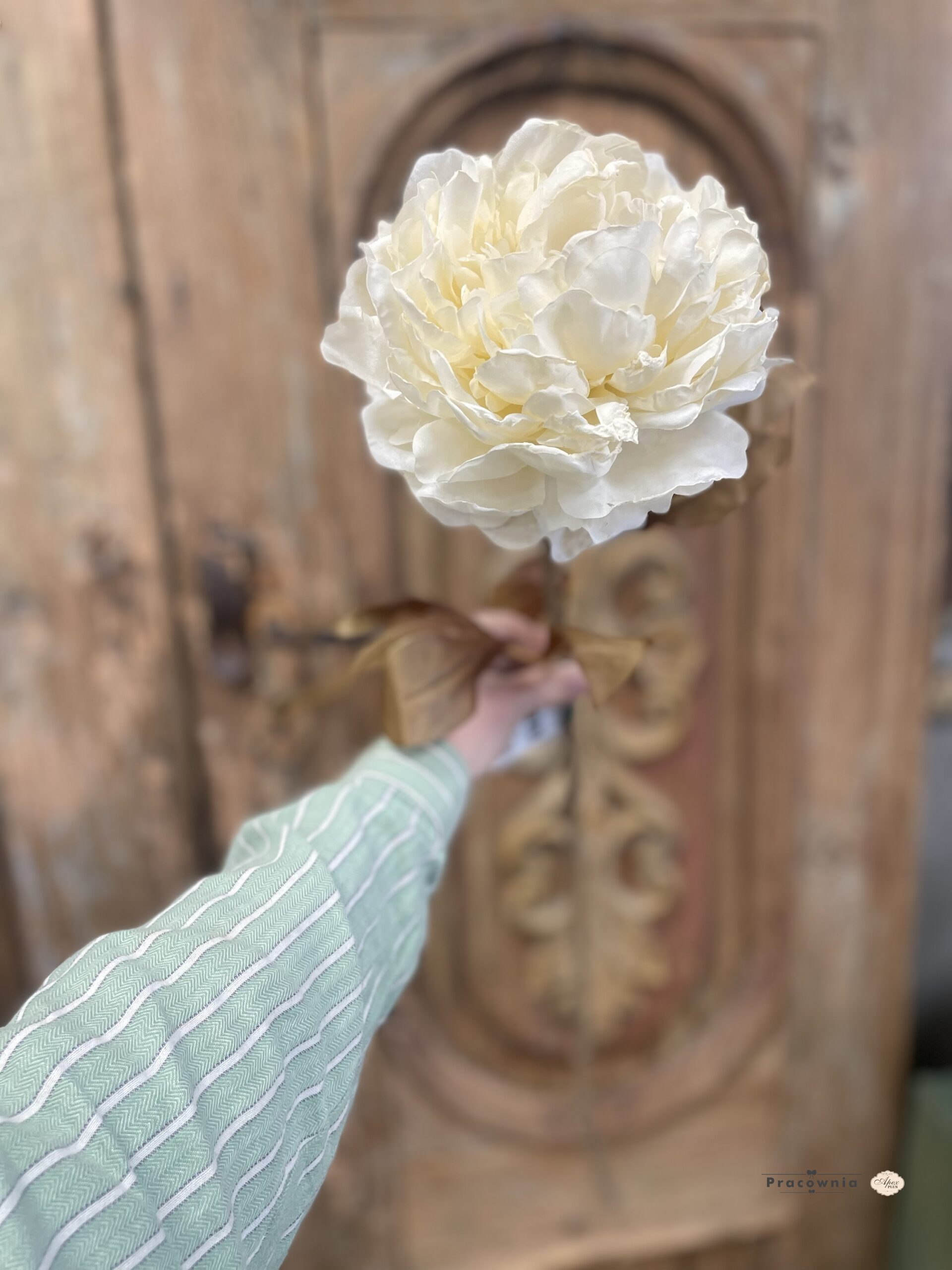 Elegancka i wyjątkowo realistyczna piwonia w odcieniu delikatnego kremu. Zachwyca gęstymi płatkami i pieknym kształtem- jak żywa. Idealna do bukietów, pojedyńczych kompozycji, witryn czy sesji zdjęciowych. Wys.75 cm, odcień kremowy z nutką boho SKU: 629707 EAN: 8720194852774