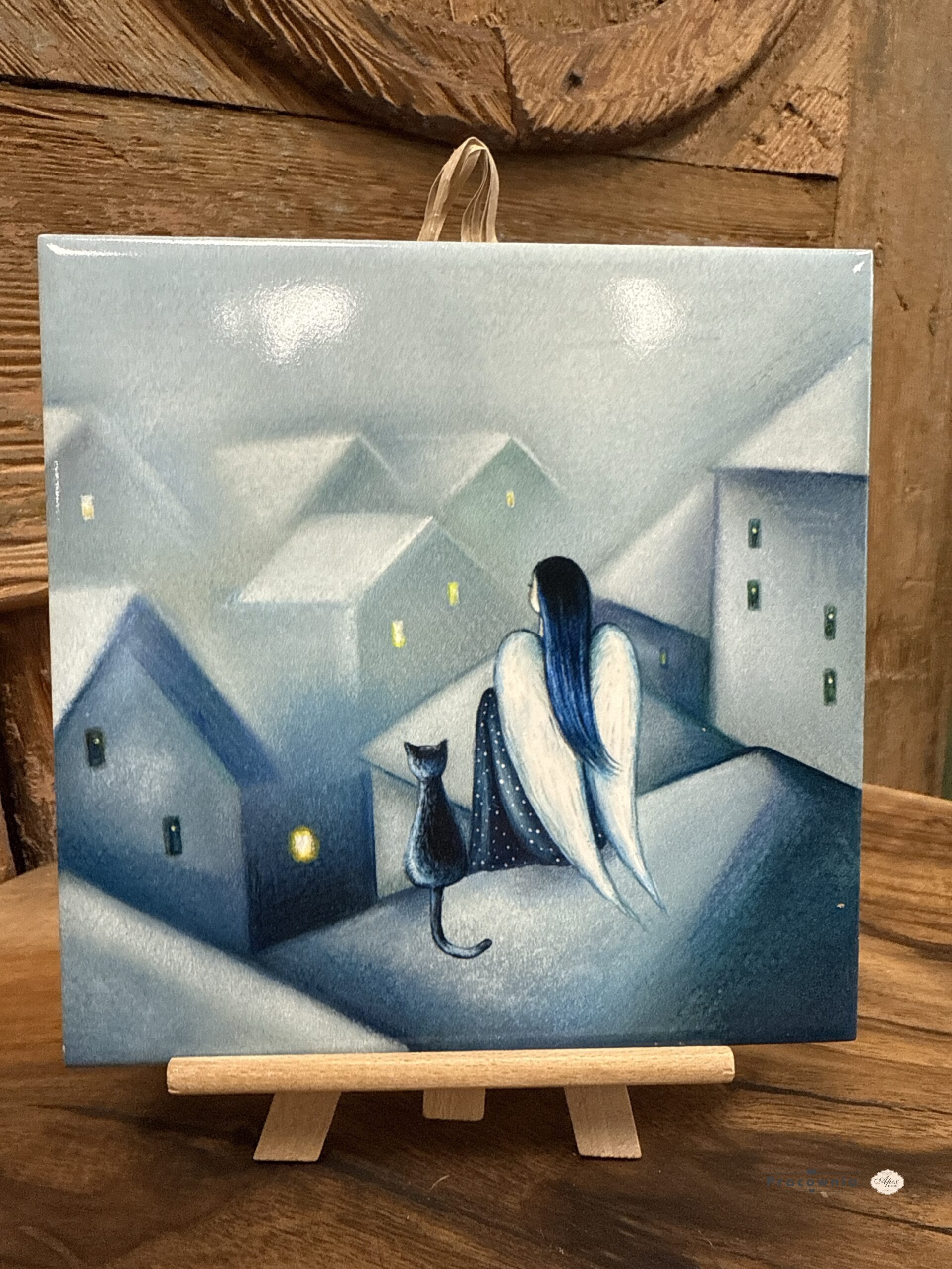 Płytka ceramiczna ” Nad miastem ” 15*15 cm Usiadł cichutko na dachu, Patrzył na miasto, zadziwiony tym co widzi… Pomyślał… czasem trzeba zmienić perspektywę, aby zobaczyć sens… SKU: N07 EAN: